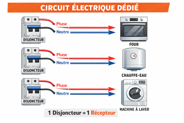 Un circuit dédié, c’est un circuit électrique réservé à un seul appareil. Concrètement, cela signifie qu’un disjoncteur dans votre tableau alimente uniquement cet appareil, et rien d’autre tout simplement.